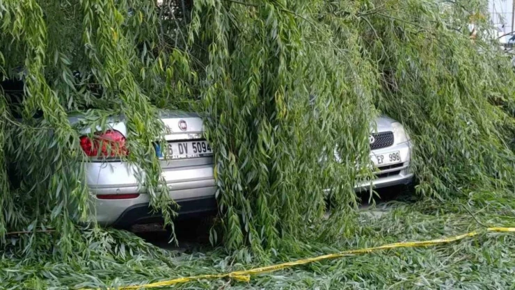Ankara'nın Altındağ ilçesinde söğüt ağacı, rüzgarda yıkılarak park halindeki araçların üzerine devrildi.