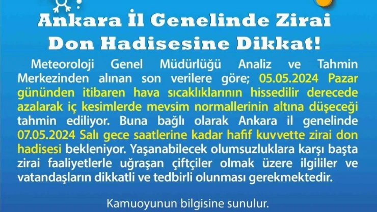 Ankara Valiliği’nin sosyal medya hesabından yapılan açıklamada, "Zirai don hadisesine dikkat. Ankara il genelinde 5 Mayıs Pazar gününden itibaren hava sıcaklıklarının mevsim normallerinin altına düşmesi ve 7 Mayıs Salı gece saatlerine kadar zirai don hadisesi beklendiğinden yaşanabilecek olumsuzluklara karşı dikkatli ve tedbirli olunması gerekmektedir" denildi.