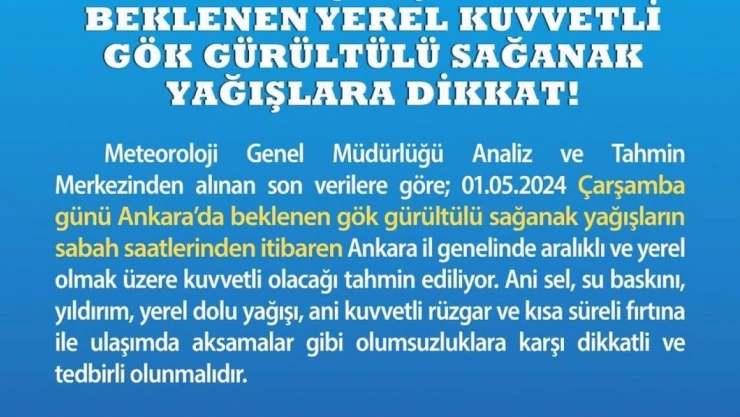 Ankara Valiliği, 1 Mayıs Çarşamba günü meydana gelebilecek kuvvetli sağanak yağış için Ankaralı vatandaşlara uyarılarda bulundu. Valiliğin sosyal medya hesabından yapılan paylaşımda, "Meteoroloji Genel Müdürlüğü Analiz ve Tahmin Merkezinden alınan son verilere göre, 1 Mayıs Çarşamba günü Ankara’da beklenen gök gürültülü sağanak yağışların sabah saatlerinden itibaren Ankara il genelinde aralıklı ve yerel olmak üzere kuvvetli olacağı tahmin ediliyor. Ani sel, su baskını, yıldırım, yerel dolu yağışı, ani kuvvetli rüzgar ve kısa süreli fırtına ile ulaşımda aksamalar gibi olumsuzluklara karşı dikkatli ve tedbirli olunmalıdır" ifadelerine yer verildi.