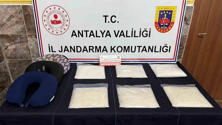 Cumhuriyet Başsavcılığının talimatları doğrultusunda, Antalya il Jandarma Komutanlığı İstihbarat Şube Müdürlüğü ve Kepez İlçe Jandarma Komutanlığı ekiplerince 3 şüphelinin uyuşturucu madde ticareti yaptığı belirlendi. İl dışından uyuşturucu madde getiren B.İ., R.G. ve K.G. düzenlenen operasyonla yakaladı. Şüphelilerin valizlerinde yapılan aramada boyuna takılan seyahat yastıkları içerisine gizlenmiş 6 kilo 150 gram metamfetamin ele geçirildi. 3 şüpheli çıkartıldıkları adli makamlarca tutuklanıp cezaevine gönderildi.