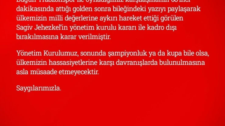 Antalyaspor’dan yapılan açıklamada şu ifadelere yer verildi: "Bugün Trabzonspor ile oynadığımız karşılaşmanın 68’inci dakikasında attığı golden sonra bileğindeki yazıyı paylaşarak ülkemizin milli değerlerine aykırı hareket ettiği görülen Sagiv Jehezkel’in yönetim kurulu kararı ile kadro dışı bırakılmasına karar verilmiştir. Yönetim Kurulumuz, sonunda şampiyonluk ya da kupa bile olsa, ülkemizin hassasiyetlerine karşı davranışlarda bulunulmasına asla müsaade etmeyecektir.”