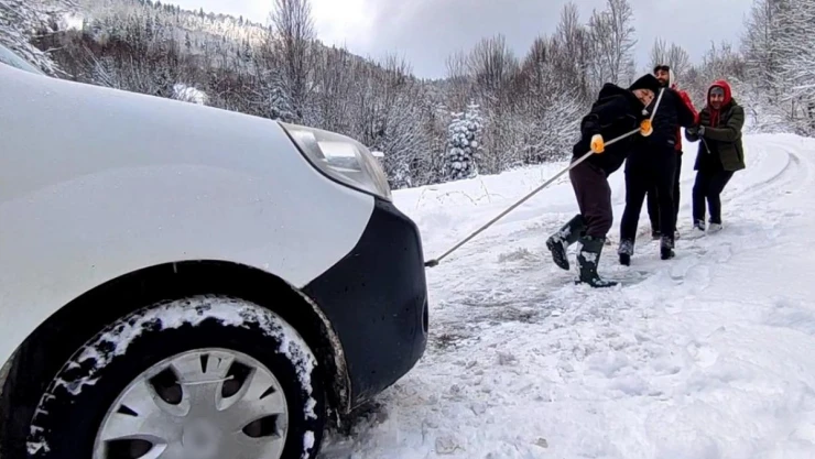 Bartın'da yolda kalan bir araç sürücüsünün yardımına yetişen köylülerin aracı kurtarmak için uyguladığı tüm yöntemler başarısız oldu. Çelik halat bağladıkları aracı elleriyle çekmeye çalışan köylüler, karla mücadele ekiplerinin yolu temizlemesi ile rahat nefes aldı.