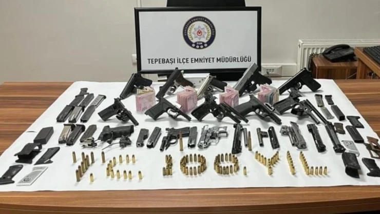 Edinilen bilgilere göre, Tepebaşı İlçe Emniyet Müdürlüğü’ne bağlı Suç Önleme ve Soruşturma Büro Amirliği ekiplerince aranması bulunan B.Ç. isimli şahsın yakalanması amacıyla çalışma gerçekleştirildi. ‘Birden Fazla Kişi ile Birlikte Konutta Geceleyin Yağma’ ve ‘Ruhsatsız Ateşli Silahlarla Mermileri Satın Alma veya Taşıma veya Bulundurma’ suçlarından arandığı tespit edilen şüphelinin saklandığı ikamete operasyon düzenlendi. Şüpheli, düzenlenen operasyonda yakalanırken, evde yapılan aramalarda 4 ruhsatsız tabanca, 1 kurusıkı tabanca, 162 adet mermi, 21 adet şarjör, 7 adet silah gövdesi, 5 adet sürgü, 2 adet tetik mekanizması, 4 adet namlu, 5 adet şarjör yayı, 10 adet kabza kapağı, 6 adet şarjör gerdeli, 10 şarjör alt kapağı ve 12 adet sentetik ecza hap geçirildi.