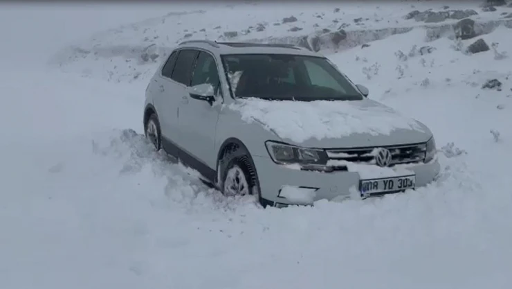 Kar ve tipi nedeniyle aracı kara saplanan sürücüler Karayolları ekiplerinden yardım talebinde bulundu.