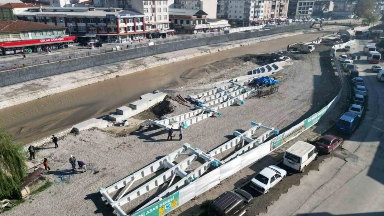 Düzce Belediyesinin şehrin iki yakasını birleştiren Asar Deresi üzerinde gerçekleştirdiği ve şehre yüzlerce yıl hizmet edecek şekilde hazırlanan proje, çelik imalatların kaynak alanlarının hazırlık çalışmaları ile devam ediyor.