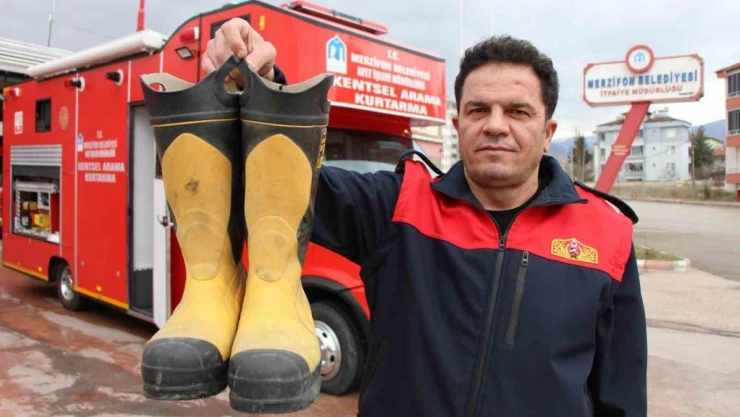 Kahramanmaraş'ta depremin yıktığı binanın enkazından kurtardıkları yaşlı adama ayağındaki botlarını çıkarıp giydirdiği görüntüleri gündem olan Merzifonlu itfaiyeci Kürşat Aydın, depremin sembolü o botlarını bir yıldır ayağına giymedi.