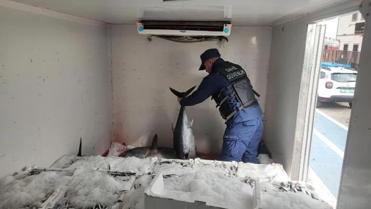Çanakkale'nin Ayvacık ilçesinde Sahil Güvenlik ekiplerince soğuk hava deposuna sahip bir kamyonette yapılan arama da avlanması yasak 11 orkinos ele geçirildi. 26 bin 242 TL idari para cezası kesildi.