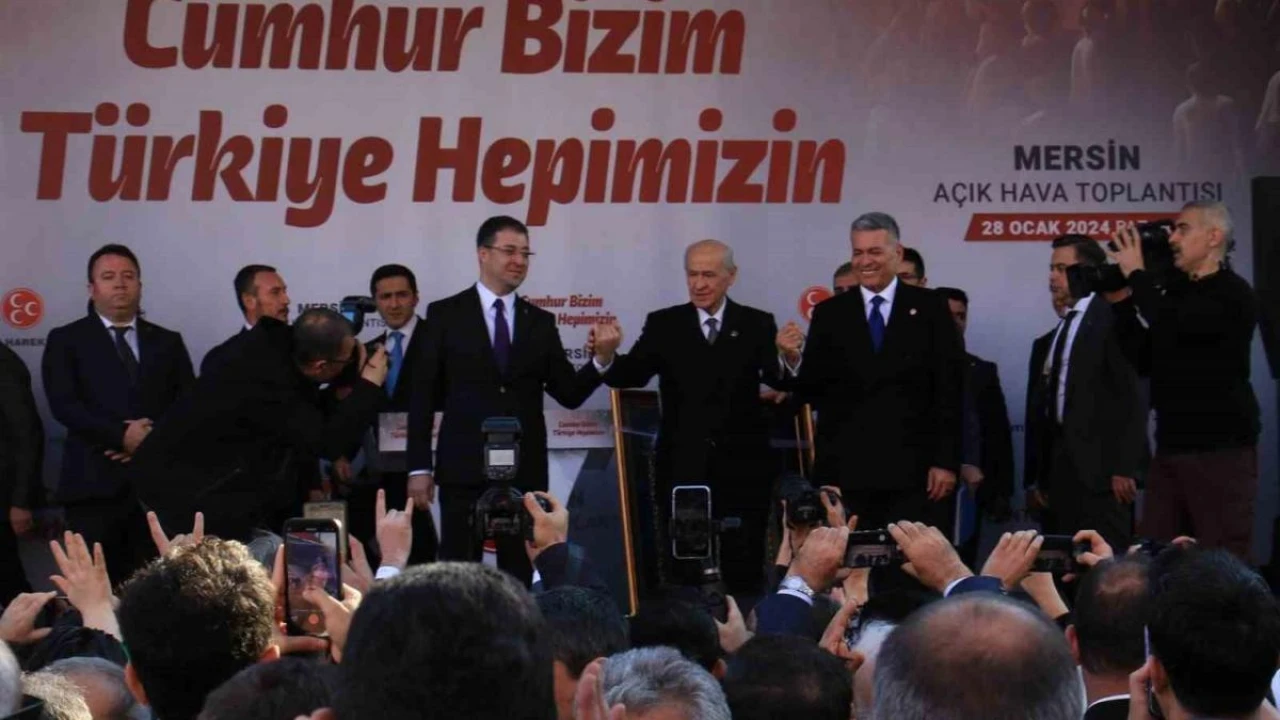Bahçeli, mart ayındaki yerel seçimler öncesi ilk mitingini, ’Cumhur bizim Türkiye hepimizin’ temasıyla Mersin Millet Bahçesi yanındaki alanda yaptı. Konuşmasının başında Mersin’in her şeyden önce tarih, kültür ve ticaret kendi olduğunu vurgulayan Bahçeli, "Aynı zamanda Mersin kardeşliğin timsalidir. Burada ayrımcılığa yer yoktur, burada aymazlığa geçit yoktur. Mersin’de, Türkiye’mizin her yöresinin kokusu hakimdir. Ne var ki Mersin son 5 yıldır yerinde saymaktadır. Slogan milliyetçiliği, dedikodu belediyeciliği, sosyal medya belediyeciliği, ideolojik ve ilkel belediyecilik anlayışı Mersin’i yorgun düşürmüştür. Kayırmacılık, haksızlık, yolsuzluk ve hukuksuzluk Mersin’in önünü kapatmıştır. Kurulan paravan şirketler kanalıyla belediye imkanlarının nerelere ve kimlere aktarıldığını ve bölücü mihrakların nasıl şımartıldığını biliyoruz. Mersin’den Anamur’a kadar, belediye eliyle peşkeş çekilen işletme, kafe ve restoranları biliyoruz. CHP’li büyükşehir belediyesi bağlanan umutları israf etmiştir. CHP’li büyükşehir belediyesi ile hayal kırıklığı devasa boyutlara ulaşmıştır. Mersinli kardeşlerimi düşünen, dertlerine derman olan, darda ve zorda kalan insanlarımızı sahiplenen, bu kentin lehine taş üstüne taş koyan belediye yönetiminden ortada ne iz ne de eser vardır. Buna karşılık devletin kaynaklarını dağıtan, ittifak ortaklarına bedel ödeyen, devamlı şaibelerle anılan bir belediye anlayışı karşımızdadır. Geride kalan 5 yıllık hüsran döneminin telafisi lazımdır. CHP zihniyeti sınıfta kalmış, hepten çuvallamıştır. Bu nedenle yapamayan gitmeli, yapacak olan gelmelidir. Artık beceriksizlere kapıyı göstermeliyiz. Artık akıntının tersine kürek çekenlere ’uğurlar olsun’ demeliyiz. Gün doğmuş, vakit gelmiştir. Mersin için ümitler yeşermiş, huzur meşalesi yakılmıştır. Mersin bizim Türkiye hepimizindir" diye konuştu.
