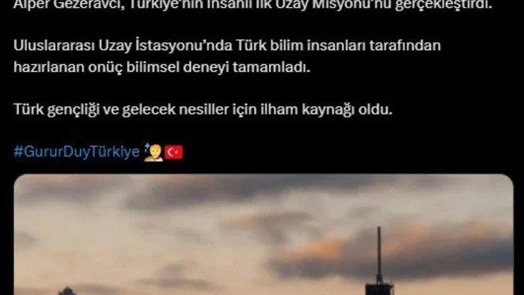 Sanayi ve Teknoloji Bakanı Mehmet Fatih Kacır, sosyal medya hesabından “Adam dönüyor” ifadeleri ile Türk astronot Alper Gezeravcı’nın Dünya’ya geri dönmek üzere uzay istasyonundan ayrıldığını duyurdu.