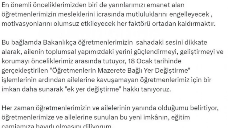 Milli Eğitim Bakanı Yusuf Tekin, 'Ailelerine kavuşamayan öğretmenlerimiz için bir imkan daha sunarak, ek yer değiştirme hakkı tanıyoruz' dedi.