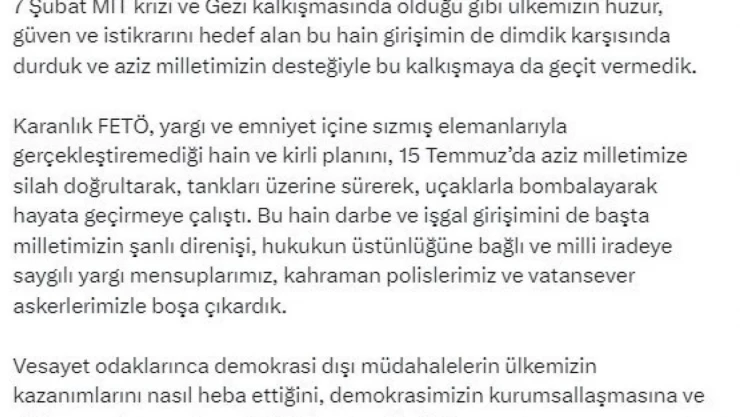 "17-25 Aralık anayasal düzenimizi ve demokratik kazanımlarımızı yok etmeyi, ülkemizi vesayetin karanlığına yeniden döndürmeyi amaçlayan, milli irade düşmanı aklın operasyonlarından biridir. 7 Şubat MİT krizi ve Gezi kalkışmasında olduğu gibi ülkemizin huzur, güven ve istikrarını hedef alan bu hain girişimin de dimdik karşısında durduk ve aziz milletimizin desteğiyle bu kalkışmaya da geçit vermedik. Karanlık FETÖ, yargı ve emniyet içine sızmış elemanlarıyla gerçekleştiremediği hain ve kirli planını, 15 Temmuz’da aziz milletimize silah doğrultarak, tankları üzerine sürerek, uçaklarla bombalayarak hayata geçirmeye çalıştı. Bu hain darbe ve işgal girişimini de başta milletimizin şanlı direnişi, hukukun üstünlüğüne bağlı ve milli iradeye saygılı yargı mensuplarımız, kahraman polislerimiz ve vatansever askerlerimizle boşa çıkardık. Vesayet odaklarınca demokrasi dışı müdahalelerin ülkemizin kazanımlarını nasıl heba ettiğini, demokrasimizin kurumsallaşmasına ve güçlenmesine nasıl engel olduğunu çok iyi biliyoruz. Yakın tarihimizde yaşadığımız acı tecrübeleri asla aklımızdan çıkarmadan, Cumhurbaşkanımız Sayın Recep Tayyip Erdoğan’ın liderliğinde 21 yıldır attığımız kararlı adımlarla temel hak ve özgürlüklerin önündeki engelleri birer birer kaldırdık. Bundan sonra da Türkiye Yüzyılı’nın inşa sürecinde demokrasimizin standartlarını yükseltmeye, hukukun üstünlüğünü esas alarak adaletin tecellisi için çok çalışmaya, aziz milletimizden aldığımız güçle ülkemizi daha da huzurlu bir geleceğe taşımaya kararlıyız."