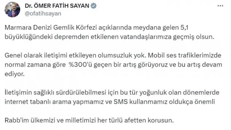 Ulaştırma ve Altyapı Bakan Yardımcısı Ömer Fatih Sayan, Marmara Denizi Gemlik Körfezi’nde meydana gelen 5,1 büyüklüğündeki deprem sonrası “Genel olarak iletişimi etkileyen olumsuzluk yok. Mobil ses trafiklerimizde normal zamana göre yüzde 300’ü geçen bir artış görüyoruz ve bu artış devam ediyor” açıklamasında bulundu.