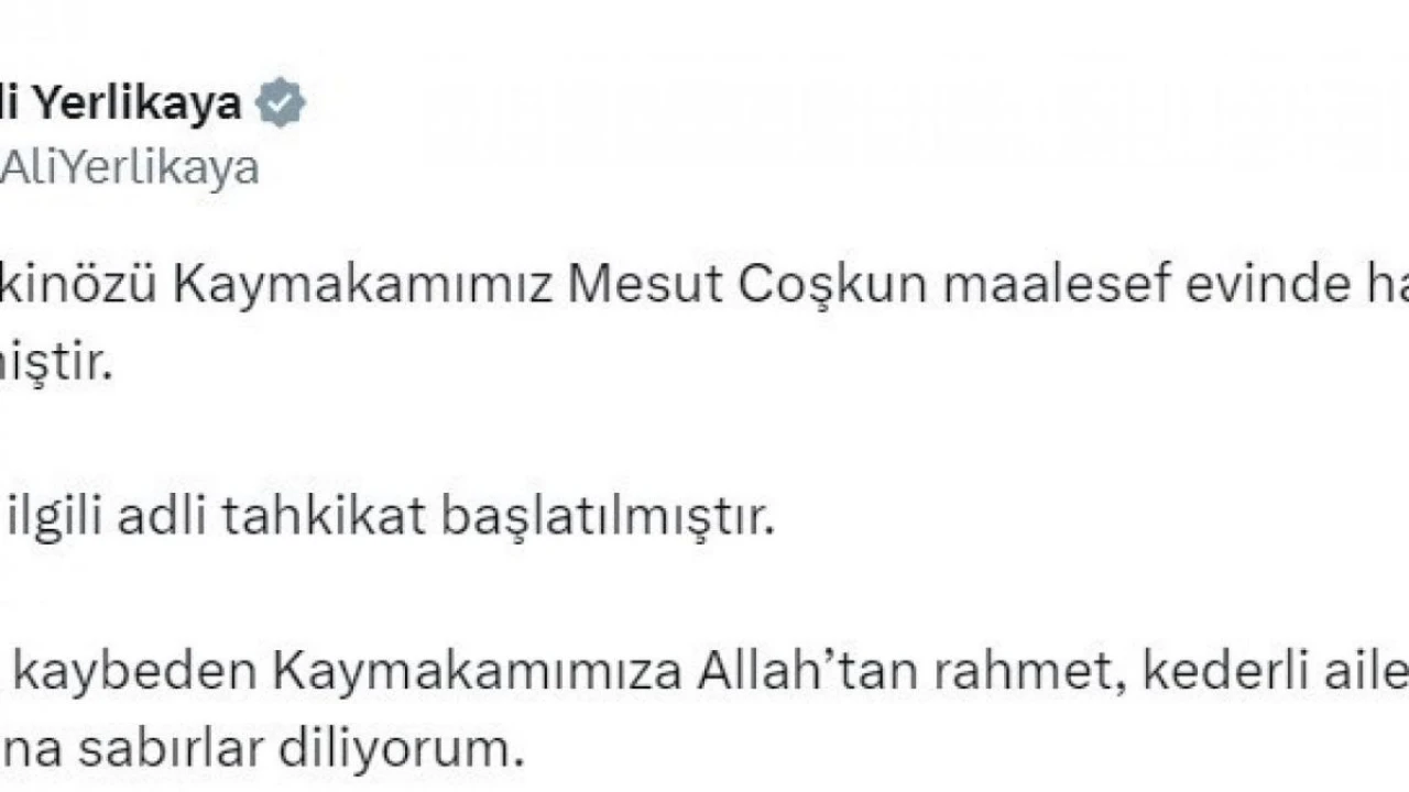İçişleri Bakanı Ali Yerlikaya, Kahramanmaraş'ta Ekinözü Kaymakamı Mesut Coşkun'un evinde ölü bulunması üzerine adli tahkikat başlatıldığını bildirdi.
