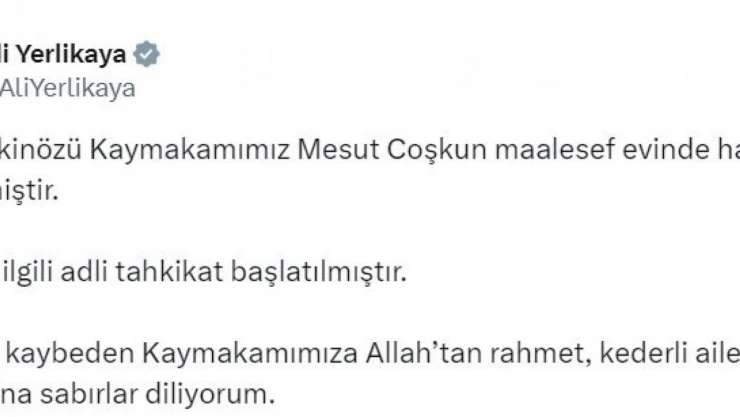 İçişleri Bakanı Ali Yerlikaya, Kahramanmaraş’ta Ekinözü Kaymakamı Mesut Coşkun’un evinde ölü bulunması üzerine adli tahkikat başlatıldığını bildirdi.