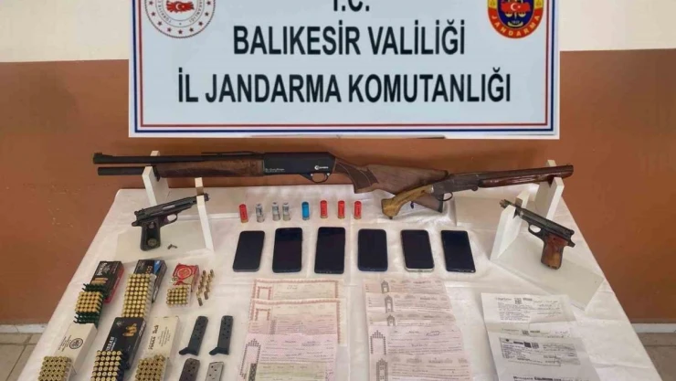 Şüphelilerin yakalanması ve suça ilişkin delillerin toplanması amacıyla Gömeç, Burhaniye ve Ayvalık ilçelerinde 5 şüpheliye ait 7 adreste icra edilen operasyonda; 2 adet tabanca, 2 adet av tüfeği, 213 adet tabanca fişeği, 4 adet tabanca şarjörü, 10 adet açık senet, 14 adet açık çek, 6 adet cep telefonu, 1 adet ev satış sözleşmesi ele geçirildi.