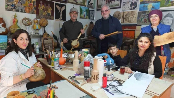 Burada evinin bahçesinde bir atölye oluşturan 68 yaşındaki 3 çocuk ve 8 torun sahibi Çavuşoğlu, resim yapmanın yanı sıra ahşap oyma ve su kabağı işleme sanatına da başladı. Evinin duvarlarına onlarca resim yapan Çavuşoğlu, evini adeta sergi salonuna çevirirken, meraklılara ücretsiz kurs vermeye başladı. Atölyeye 2 yıldır geldiğini anlatan Ayşegül Bayraktar, “Ergenç hocamın bir iyilik hikayesi yolculuğu ile başlayan bu atölyemize ben 2 yıldır geliyorum. Kabak yapıyorum. Daha sonra yeğenlerimi getirdim. Küçükten büyüğe herkes kendini keşfedebilir. Burada resim, kabak, herhangi bir istediği hobisini geliştirebilir” dedi. Yağmur Bayraktar da, “İlk önce oğlumu getirdim buraya. Resim yaptık. Daha sonra kabak oymaya başladık. Bende heveslendim, Ergenç hocamı gördükçe. Burada yaptıkları resimleri ve etkinlikleri görünce çok mutlu oldum. Bende heveslendim. Beni de heveslendirdi. Bizde karakaleme başladık. Anne oğul buraya hafta sonları buraya geliyoruz. Güzel vakit geçiriyoruz. Çocuklar için de çok güzel” dedi. Ergenç Çavuşoğlu ise, “Dört yıldan beri bu sanat atölyesini işletmekteyim. Daha öncesinde resim kursuna katıldım. Ahşap oyma kursuna katıldım. Şimdi ücretsiz olarak isteyenlere her türlü resim kursu, ahşap oyma kursu, su kabağı işleme kursu veriyorum. Ahşap boyama kursu da veriyorum. Bayağı da öğrencim var. Geliyorlar, hafta içi hafta sonu birlikte çalışıyoruz. Güzel zaman geçiriyoruz. Onlar zamanlarını değerlendiriyorlar. İstedikleri hobiyi de öğrenmiş bulunuyorlar” dedi.