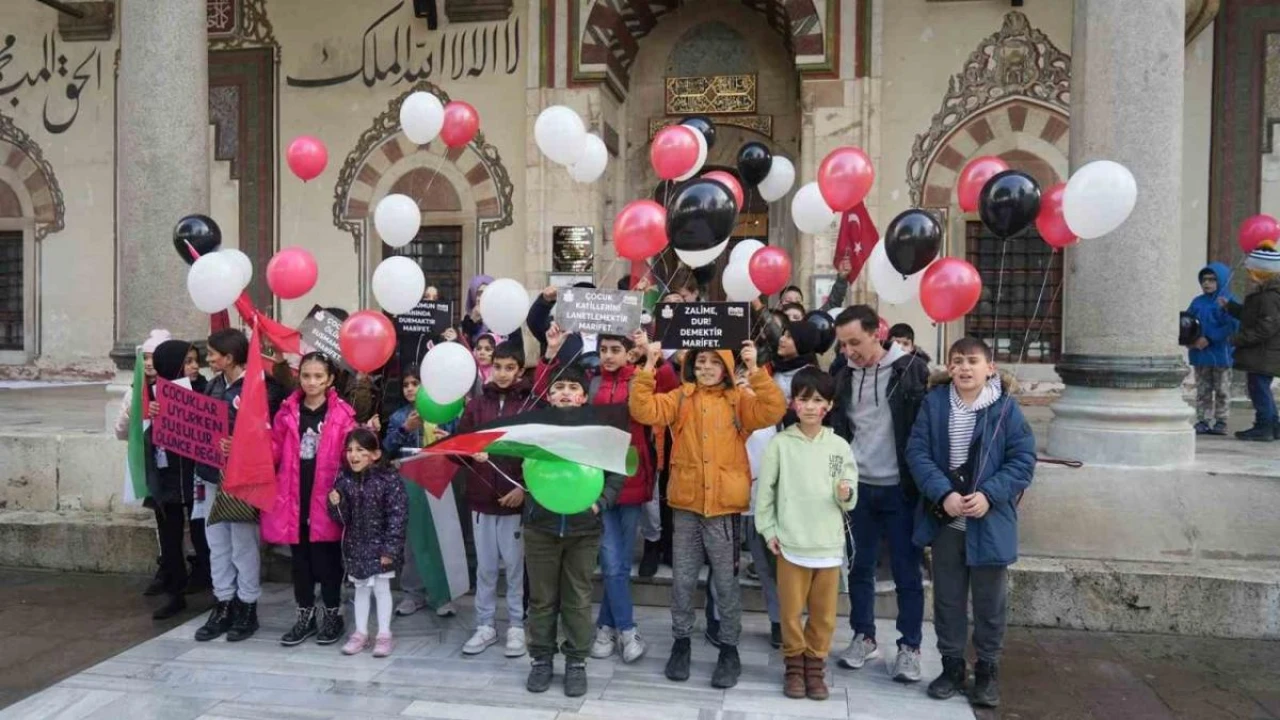 İsrail güçleri tarafından Filistin’e düzenlenen saldırılarda ölen çocuklara dikkat çekmek için Manisa’nın Sultan Camii bahçesinde toplanan çocuklar ellerinde balonları gökyüzüne bıraktı.