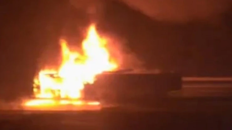 Polis ekipleri yolda güvenlik önlemi alırken itfaiye ekipleri alev alev yanan otobüse müdahale etti.