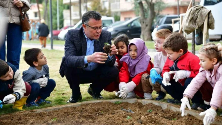 Başkan Öküzcüoğlu öğrencilerle birlikte çiçek dikti