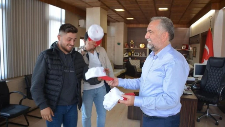 Başkan Sargın, öğrencilere 100. Yıl logolu şapka ve Atatürk rozeti hediye etti.