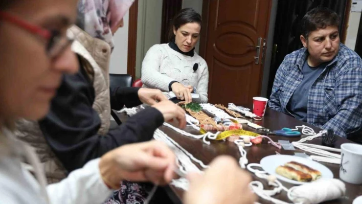 Belevi'ye giderek kursiyer kadınları ziyaret eden Selçuk Belediye Başkanı Filiz Ceritoğlu Sengel, kadınlarla birlikte makrome yaptı.