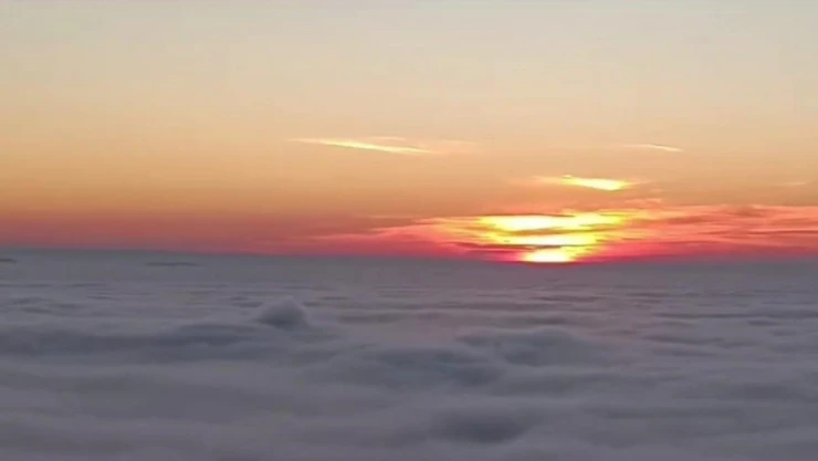 Karlı kaplı dağlar, güneş ve sis birleşince görsel şölen oluştu.