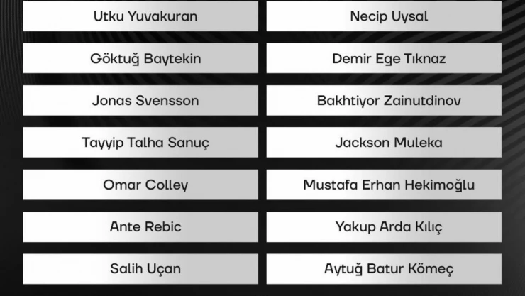 "Ersin Destanoğlu, Utku Yuvakuran, Göktuğ Baytekin, Konas Svensson, Tayyip Talha Sanuç, Omar Colley, Ante Rebic, Cenk Tosun, Salih Uçan, Milot Rashica, Daniel Amartey, Rachid Ghezzal, Necip Uysal, Demir Ege Tıknaz, Bahtiyar Zaynutdinov, Jaackson Muleka, Mustafa Erhan Hekimoğlu, Yakup Arda Kılıç, Aytuğ Batur Kömeç, Emrecan Terzi, Gedson Fernandes ve Emrecan Bulut."