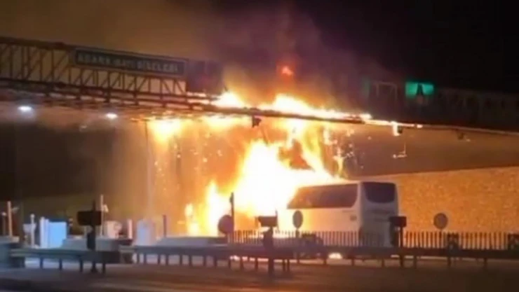 Adana’da, A.A firmasına ait yolcu otobüsünün gişelere çarpması sonucu çıkan yangında 6 kişi yaralanırken araç demir yığınına döndü.