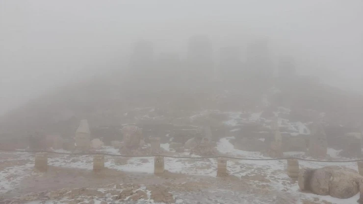 Adıyaman’da etkili olan yağmur yağışı, 2 bin 206 metre yükseklikteki Nemrut Dağı’nda kar olarak yağdı. Kar yağışı ile beyaza bürünün Nemrut Dağı’nda yoğun sis etkili oldu. Devasa heykeller sis nedeniyle görünmez oldu.