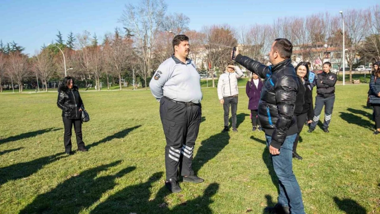 Bursa Büyükşehir Belediyesi’nin açık ve kapalı hizmet alanlarında görevli özel güvenlik personeli, göz yaşartıcı spreyin etkilerini önce kendi gözlerinde hissetti. Teorik eğitimde biber gazının nasıl kullanılacağını öğrenen personel, gazın etkisini ise yüzlerine biber gazı sıkılınca yaşayarak hissetti.