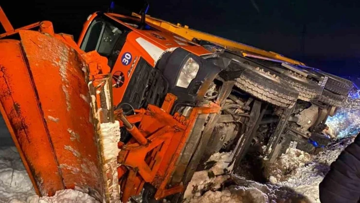Bilecik'in Pazaryeri ilçesinde karayolunda kar kürüme ve tuzlama yapan kamyon devrildi.