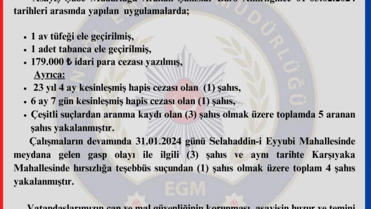 Bingöl İl Emniyet Müdürlüğüne bağlı Aranan Şahıslar Büro amirliği, 1-5 Şubat tarihleri arasında çeşitli faaliyetler gerçekleştirdi. Bu faaliyetlerde, farklı suçlardan aranan şüpheli şahıslar yakalandı. İl Emniyet Müdürlüğünden yapılan açıklamada, ’’1 adet av tüfeği ve 1 adet tabanca ele geçirildi, 179 bin idari para cezası yazıldı. Ayrıca 23 yıl 4 ay kesinleşmiş hapis cezası olan 1 şahıs, 6 ay 7 gün kesinleşmiş hapis cezası olan 1 şahıs, çeşitli suçlardan aranma kaydı olan 3 şahıs olmak üzere toplamda 5 aranan şahıs yakalanmıştır” denildi.