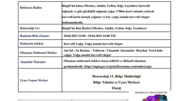 Bingöl Valiliği tarafından yapılan açıklamaya göre Meteoroloji 13. Bölge Müdürlüğü tarafından yapılan tahminler doğrultusunda Bingöl merkez, Adaklı, Yedisu, Kiğı ve Yayladere ilçelerinde kuvvetli sağanak ve gök gürültülü sağanak yağış beklendiği açıklandı. Yağışların, bugün gece saat 22.00 sıralarında başlaması ve kuvvetli rüzgarın yarın saat 14.00’a kadar sürmesi bekleniyor. Açıklamada bin 700 metre üzeri rakımlı yerlerde kuvvetli karla karışık yağmur ve kar yağış beklenirken merkez ve ilçelerde ise ani sel, su baskını, yıldırım, ulaşımda aksamalar, heyelan, yerel dolu yağışı ve yağış anında kuvvetli rüzgara karşı vatandaşların dikkatli olması gerektiği belirtildi.