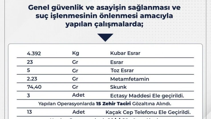 Bingöl Valisi Ahmet Hamdi Usta, İl Emniyet Müdürlüğü ve İl Jandarma Komutanlığı ekiplerinin 5-12 Şubat tarihleri arasında gerçekleştirdiği faaliyetleri paylaştı. Uyuşturucu operasyonlarında 15 kişinin gözaltına alındığını belirten Vali Usta, “4 kilo 392 gram kubar esrar, 23 gram esrar, 5 gram toz esrar, 2 gram metamfetamin, 74 gram skunk, 3 adet ectasy maddesi ele geçirildi. Yapılan operasyonlarda 15 zehir taciri gözaltına alındı. 13 adet kaçak cep telefonu ele geçirildi, 1 kişi gözaltına alındı. 17’si yabancı uyruklu olmak üzere 64 bin 810 şahıs sorgulandı, aranan 302 şahıs tespit edilerek 8 gözaltı, 4 tutuklama yapıldı. 21 bin 475 araç denetlendi, 734 araca cezai işlem uygulandı, 43 araç trafikten men edildi” dedi.