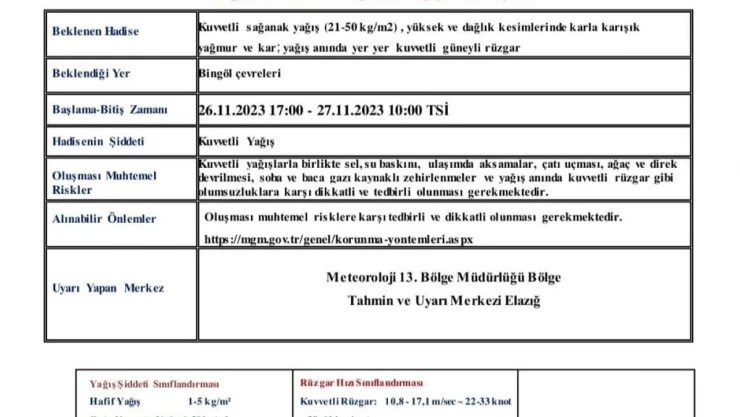 Bingöl Valiliğinden yapılan açıklamada, "Meteoroloji 13. Bölge Müdürlüğü Bölge tahminlerine göre 26.11.2023 saat 17.00 ile 27.11.2023 saat 10.00 arasında kuvvetli sağanak yağış (21-50 kg/m2), yüksek ve dağlık kesimlerinde karla karışık yağmur ve kar yağış anında yer yer kuvvetli güneyli rüzgar beklenmektedir. Kuvvetli yağışlarla birlikte sel, su baskını, ulaşımda aksamalar, çatı uçması, ağaç ve direk devrilmesi, soba ve baca gazı kaynaklı zehirlenmeler ve yağış anında kuvvetli rüzgar gibi olumsuzluklara karşı dikkatli ve tedbirli olunması gerekmektedir. Oluşması muhtemel risklere karşı tedbirli ve dikkatli olunması gerekmektedir" denildi.