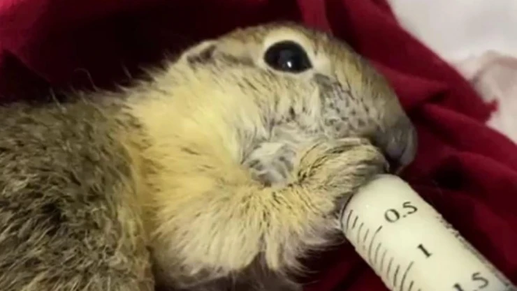 Bitkin halde bulunan yavru Anadolu yer sincabı şırıngayla besleniyor
