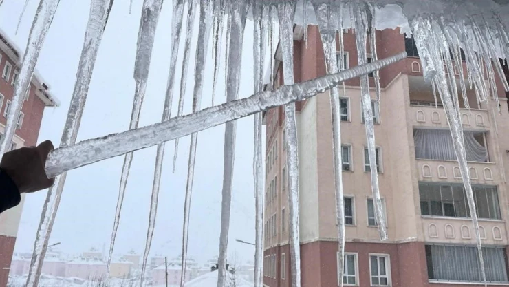 Bitlis’te etkili olan kar yağışı ve soğuk havadan dolayı çatılardaki buz sarkıtlarının boyu 2 metreyi buldu.