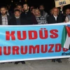 Pankart taşıyan vatandaşlar, Filistin bayraklarıyla tekbir getirerek sloganlar attı.