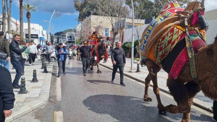 Rengarenk süslenen develeri gören Bodrumlular ve ilçede bulunan turistler ise bu anları, cep telefonlarıyla ölümsüzleştirdi.