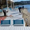 Muğla'nın Bodrum ilçesinde belediye ekiplerinin müdahalesi sonucu sahilde kıyı işgaline sebep olan ahşap platform sökülüyor.