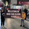 ’Şehitler ölmez, vatan bölünmez’ sloganı atan grup, araçlarına binip konvoy oluşturdu. Gruptan bazıları ‘Milletimizin başı sağ olsun’ pankartı ile dev Türk bayrağı açıp 30 araçlık konvoyun önünde yürüdü.
