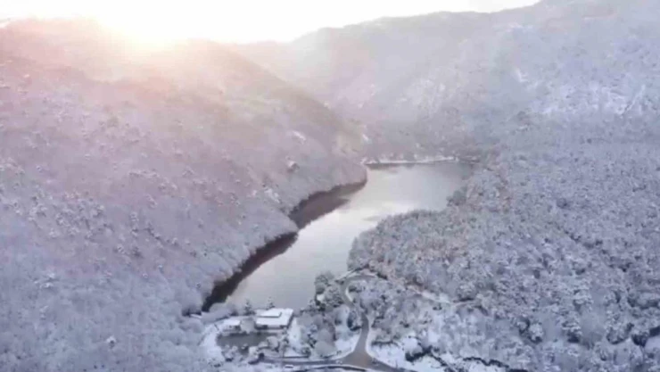Amasya’nın doğal güzelliğiyle ünlü Boraboy Gölü’nün etrafı yağan karla beyaza büründü. Kartpostallık manzara havadan dron ile görüntülendi.