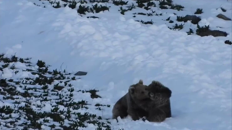 Arazide bir süre yiyecek arayan ayılar daha sonra karlı zemin üzerinde koşturdu, sonra kar üzerinde yuvarlanmaya başladı. Güreşen ayıların görüntüsü gülümsetti.