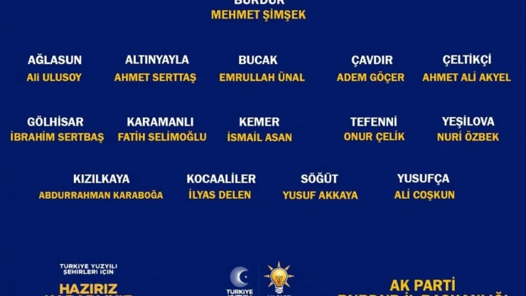 Diğer ilçelerde ise AK Parti’den aday gösterilen isimler; Çavdır ilçesi Adem Göçer, Çeltikçi ilçesi Ahmet Ali Akyel, Tefenni ilçesi Onur Çelik, Yeşilova ilçesi Nuri Özbek olarak açıklandı.