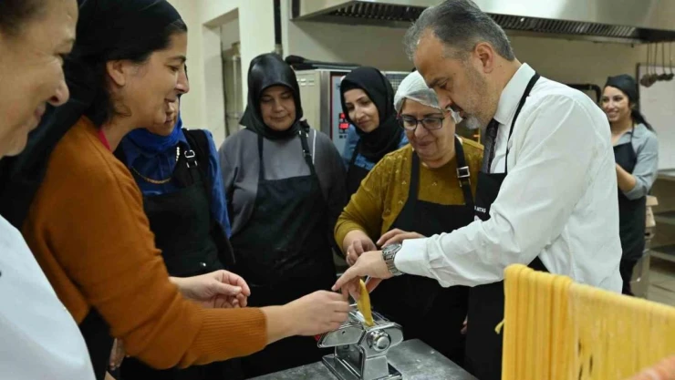 Program sonunda eğitim sınıflarını gezen Başkan Alinur Aktaş, önlük giyerek mutfaktaki hünerlerini sergiledi. Kursiyerlerle birlikte el yapımı makarna ve yaş pasta yapan Başkan Aktaş, daha sonra yaptığı ürünleri kursiyerlere ikram etti.