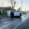 Büyükçekmece'de buzlanan yolda araç yan yattı