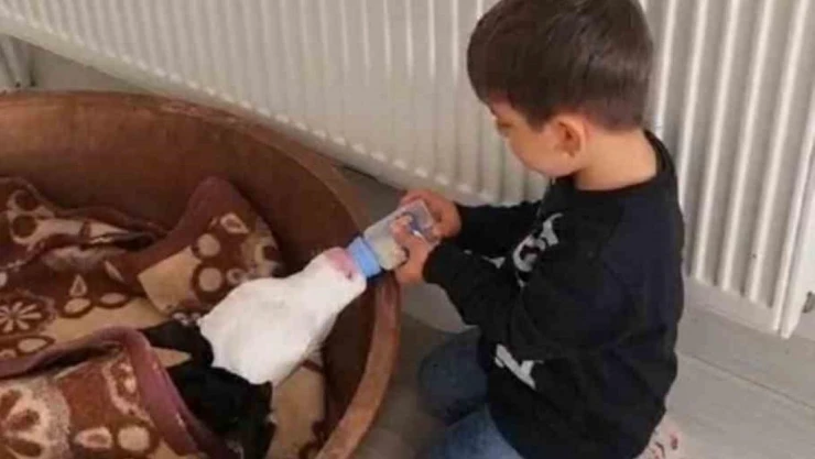 Tokat'ta bir çocuğun erken doğan buzağıyı biberonla beslediği görüntüler yürekleri ısıttı.