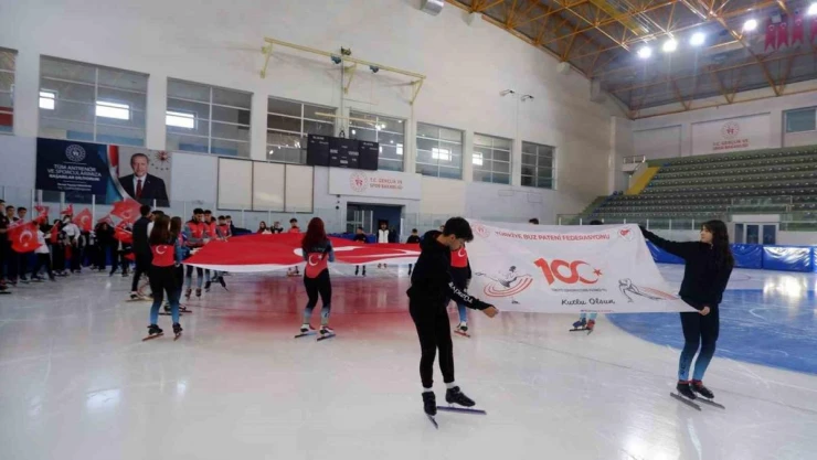 Türkiye Cumhuriyeti’nin 100. Yılı kutlamaları çerçevesinde sporcular Erzurum’da buz üzerinde kutlama yaptı.