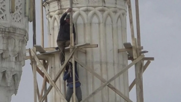 Iğdır'da fırtına ve rüzgardan zarar gören merkez Ulu caminin onarım işçileri metrelerce yükseklikte güvenlik önlemi almadan çalışıyorlar.