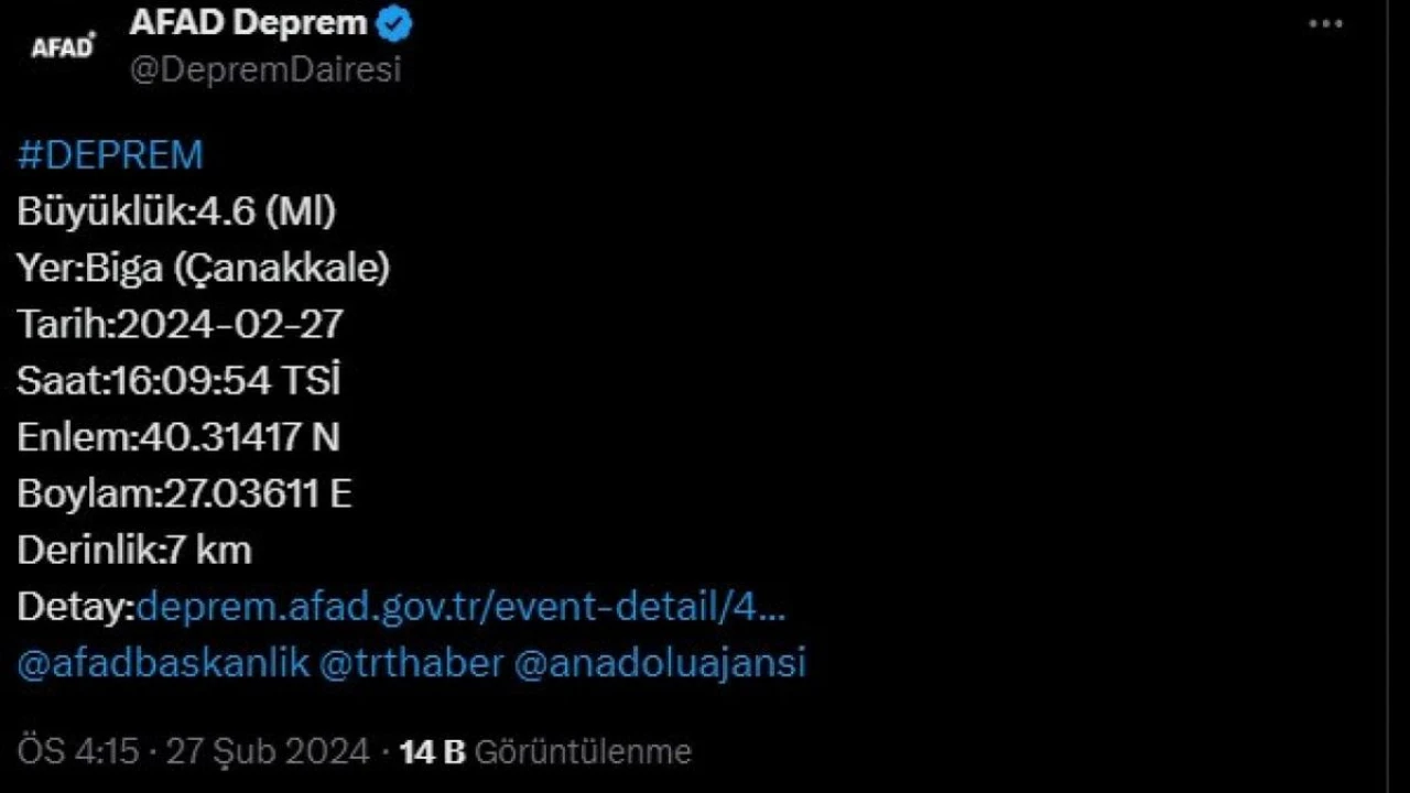 Afet ve Acil Durum Yönetimi Başkanlığı (AFAD), Çanakkale'nin Biga ilçesinde 4.6 büyüklüğünde deprem meydana geldiğini açıkladı.